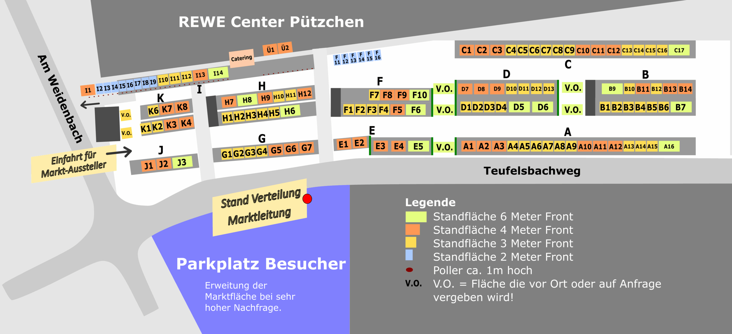- Der Markt ist häufig ausgebucht. Um alle Lücken zu füllen, können zusätzlich zum Plan Stände eingeteilt werden.